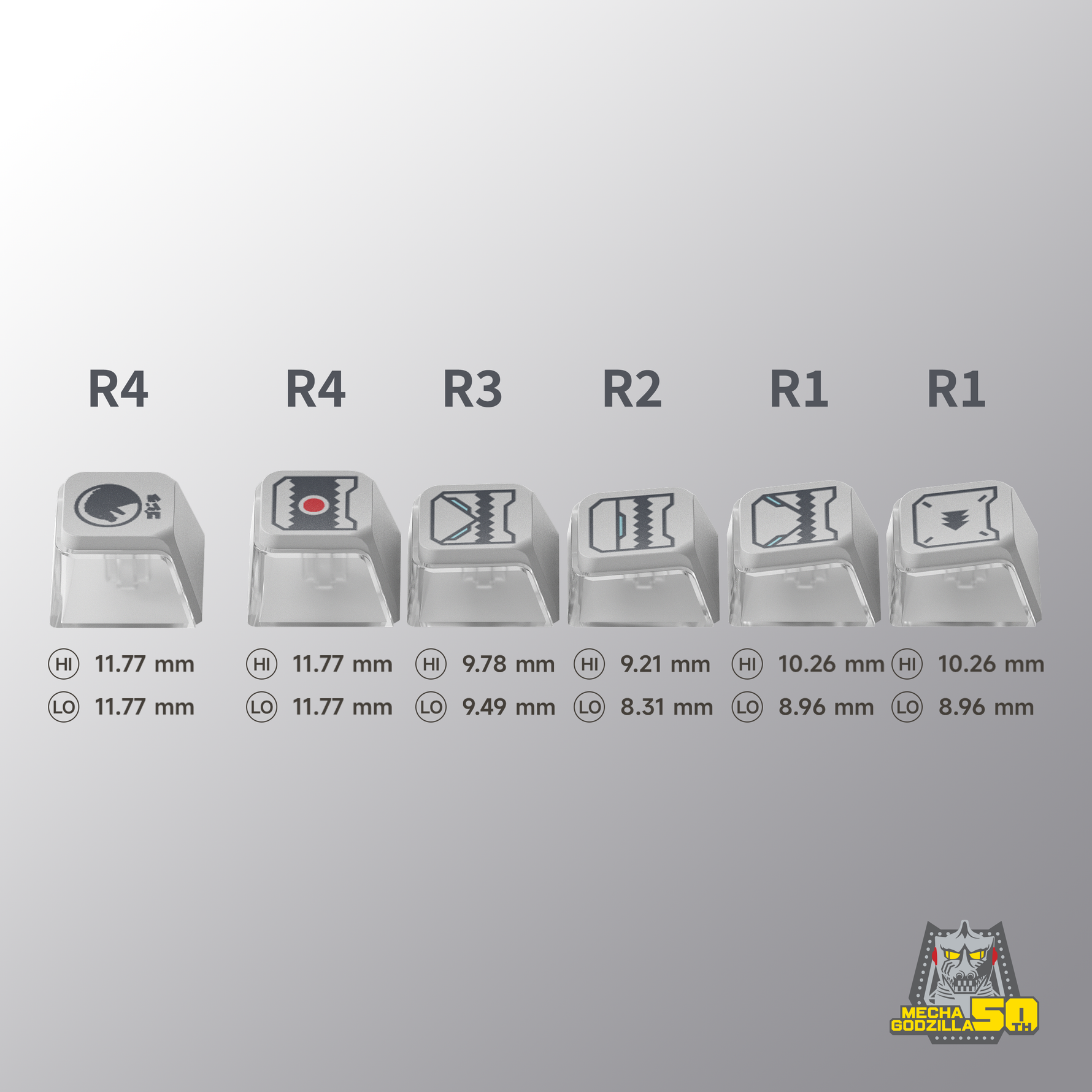 Celebrate Mechagodzilla’s 50th anniversary with these themed keycap set built to dominate your setup. Crafted from premium PBT with a dual-color polycarbonate shell and a sleek UV finish, these keycaps channel the unmistakable elements of the iconic mecha kaiju. Turn on your RGB backlight to reveal its edge glow design—an effect that’s as deadly as it is stunning. Each key features legendary imagery from across the Mechagodzilla series!